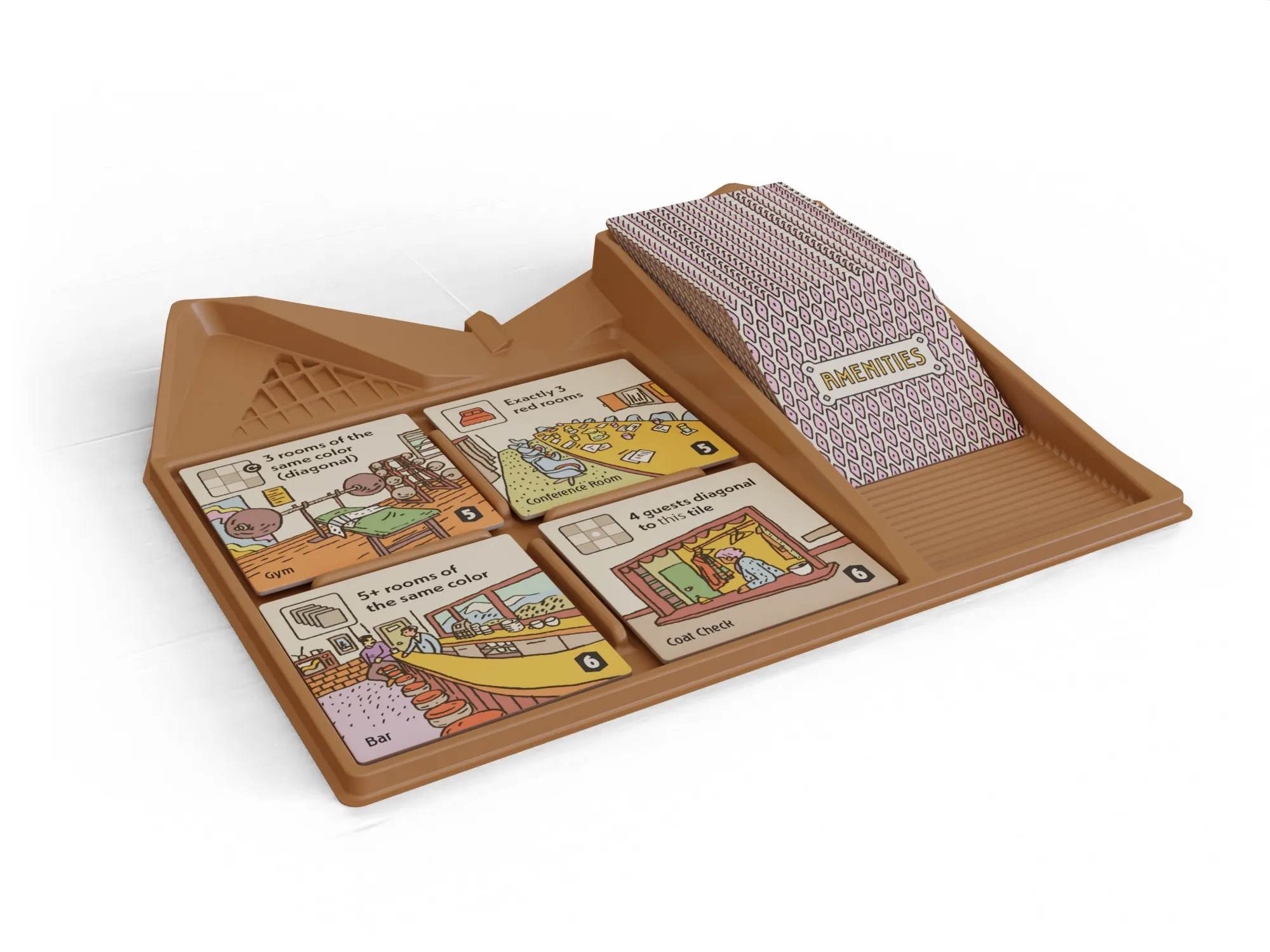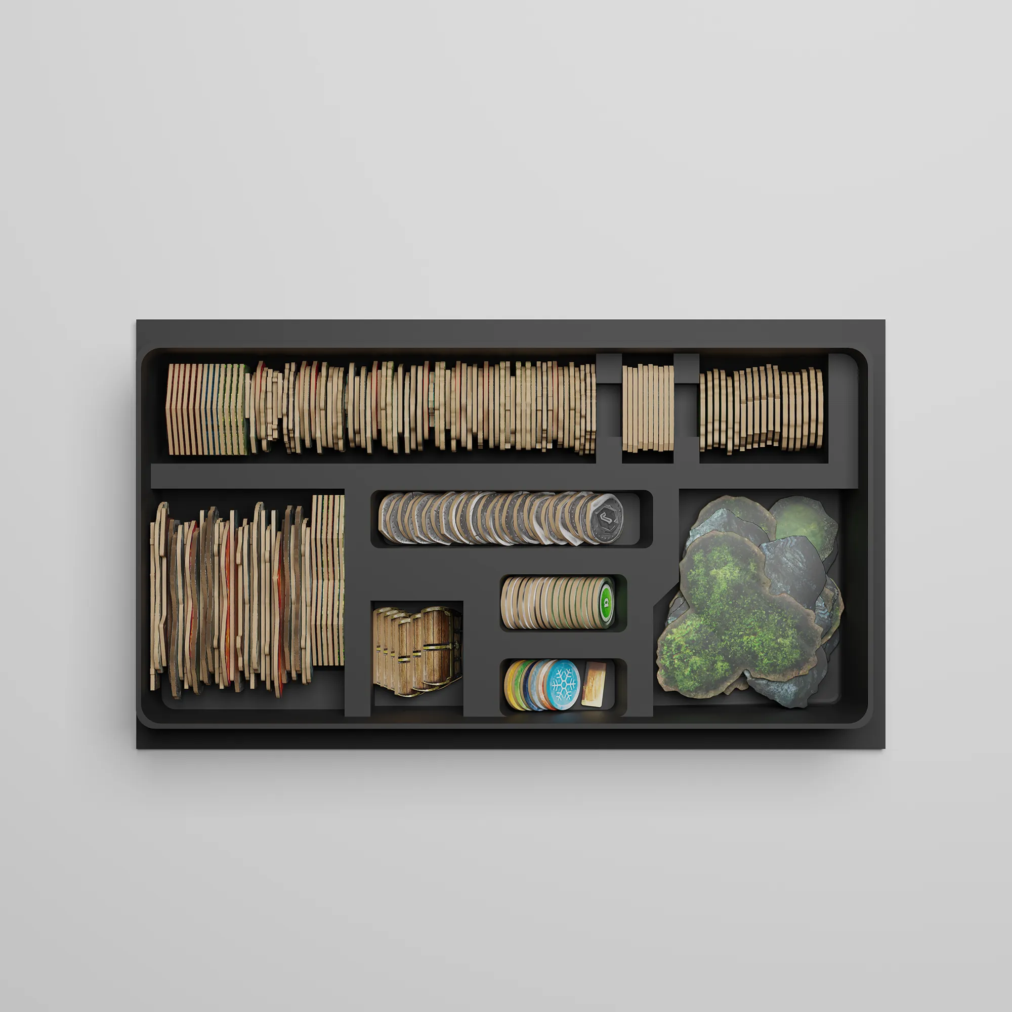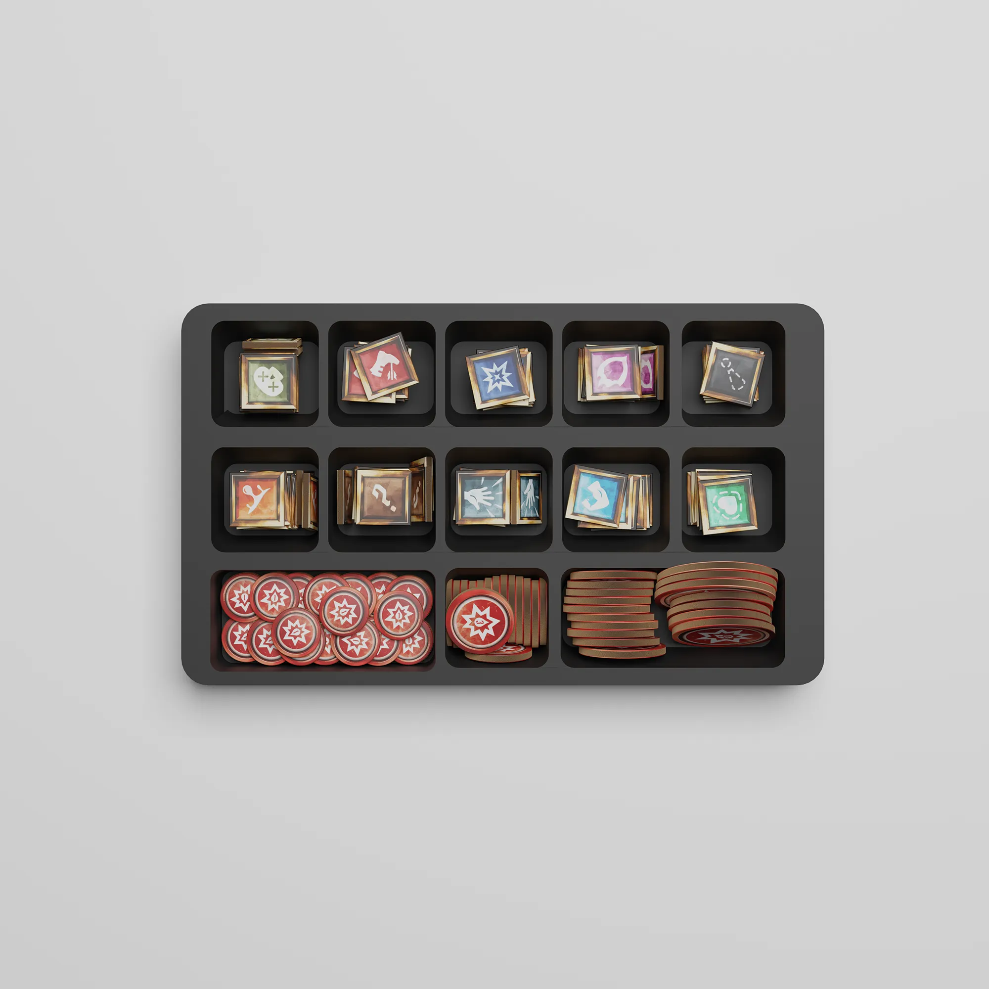 These are our “in play” photos, perfect for Kickstarter, social media, and your website to give folks a feel of what the game looks like at your table. Typically rendered in a very simple fashion.